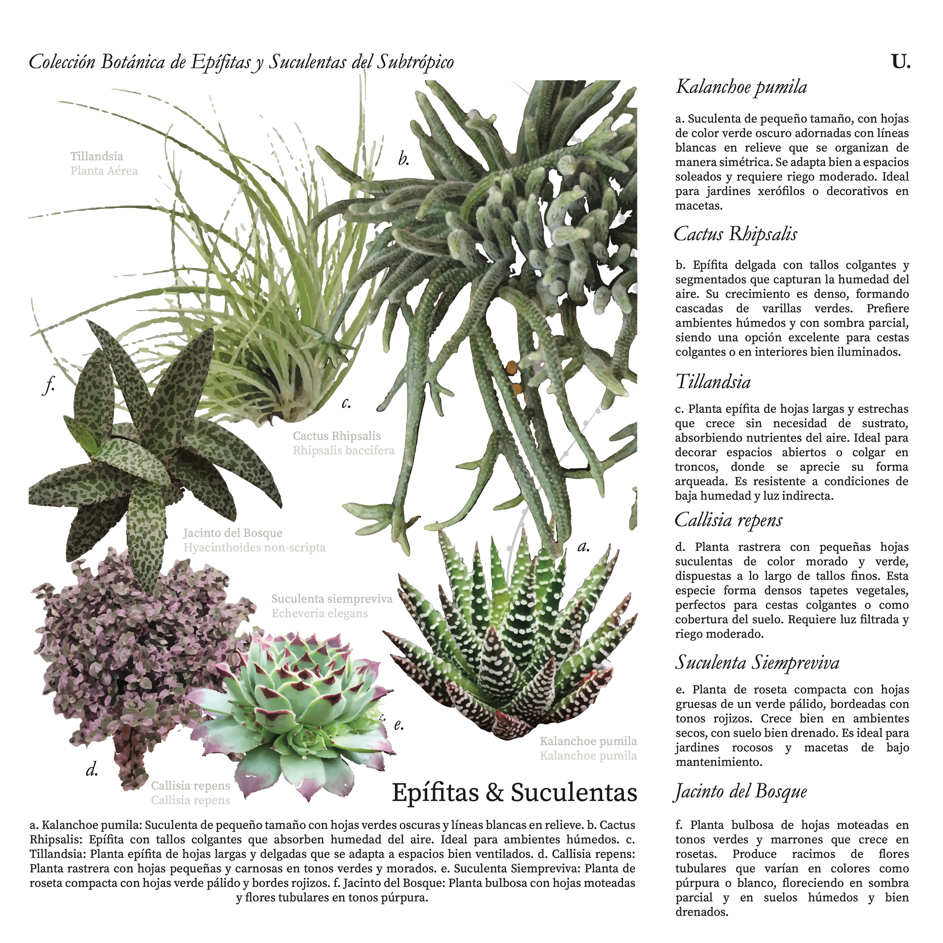 - Riego: La Tillandsia debe ser rociada (con poca agua) de 2 veces por semana. Las suculentas como el Kalanchoe pumila y la Suculenta Siempreviva necesitan riego moderado, permitiendo que el sustrato se seque entre riegos. La Callisia repens y el Cactus Rhipsalis prefieren una humedad más constante, pero sin encharcamientos.