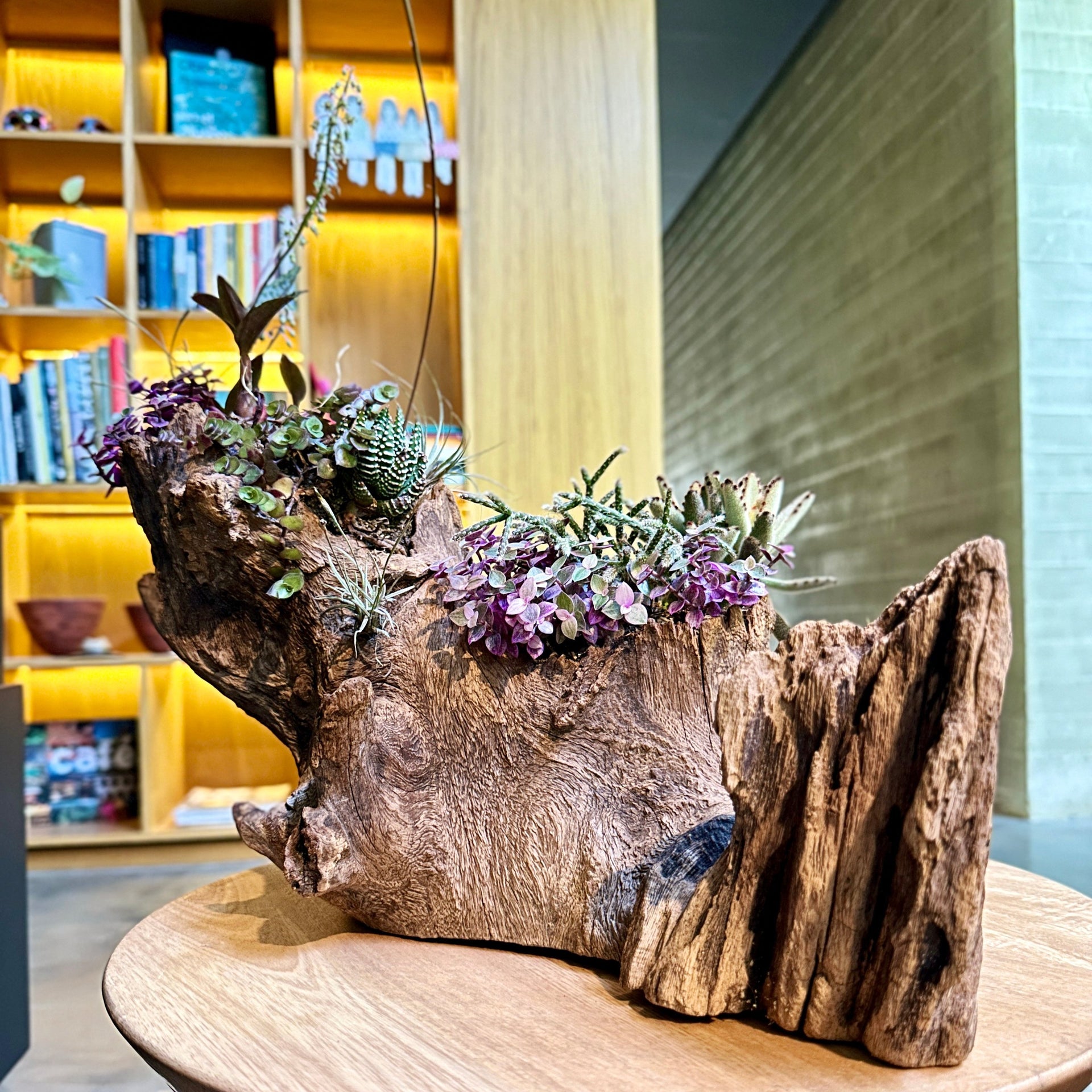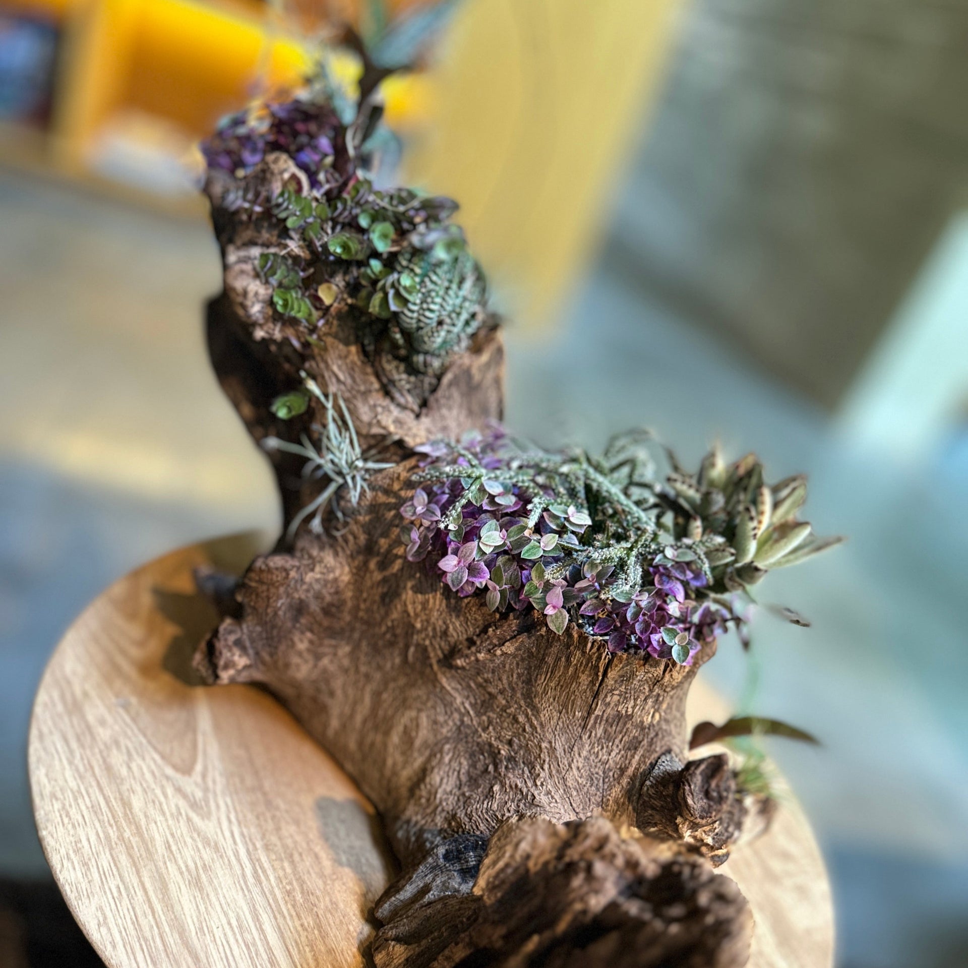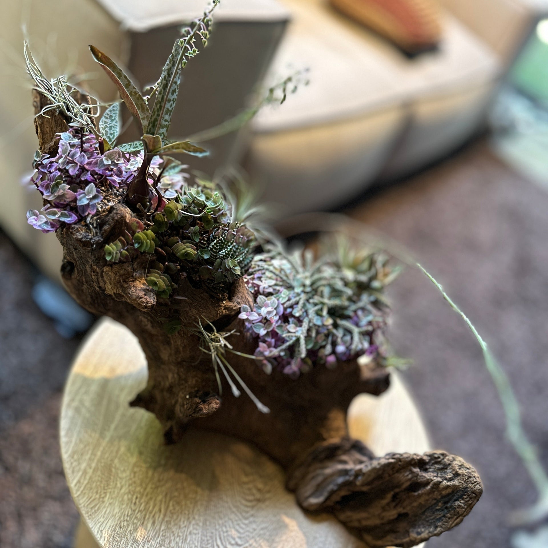Esta delicada pieza botánica presenta una selección cuidadosamente equilibrada de epífitas y suculentas, organizadas de manera armónica sobre una raíz natural. Las texturas contrastantes y los colores suaves aportan una sensación de calma, mientras que las formas geométricas de las plantas ofrecen un atractivo visual dinámico.